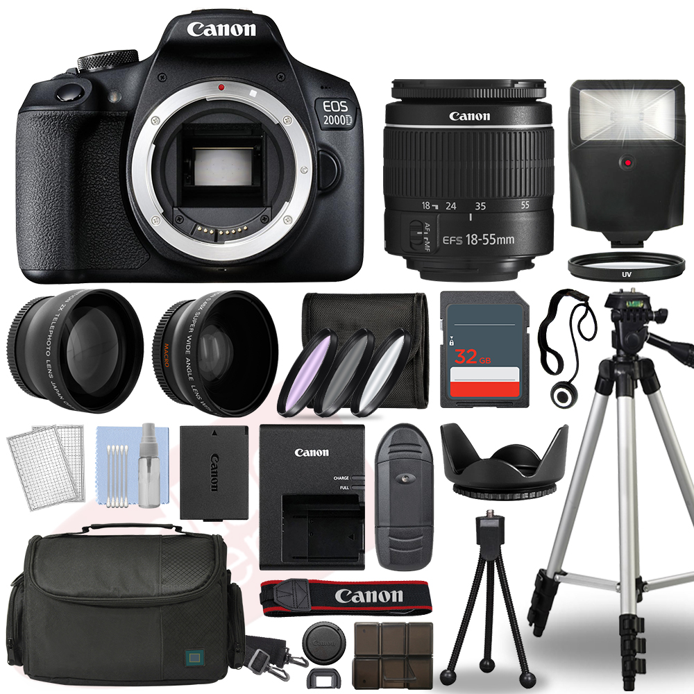 Canon EOS 2000D / Rebel T7 SLR Camera + 3 Lens Kit 18-55mm + 32GB + Flash & More